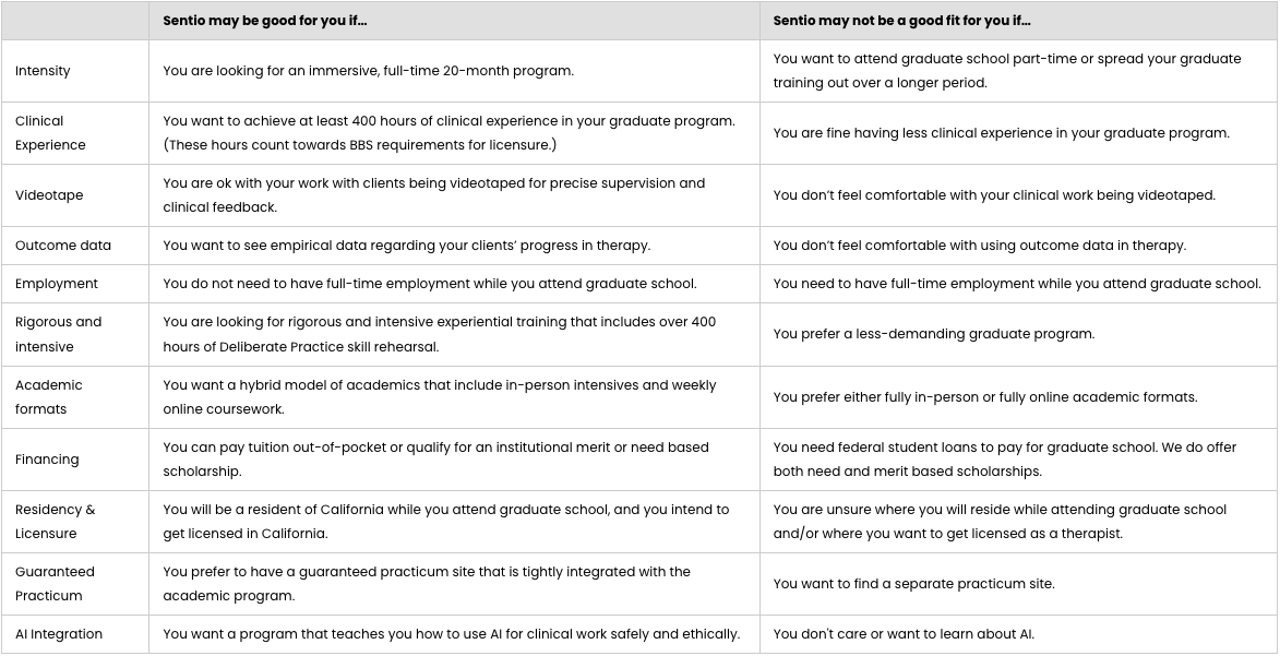 Sentio is a brand-new training program that has significant differences from other schools regarding student experience, cost, limits on licensure, and more. We recognize that Sentio will not be a good fit for many students. We encourage you to compare Sentio to other MFT programs in California and carefully consider which program will be the best fit for your personal preferences and needs.